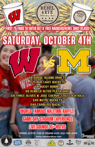 Rebel & Rye is the official home for Wisconsin Badgers fans in Chicago, and we’re going big for the showdown with Michigan. The first 25 fans through the door score a free Badgers x Rebel shot glass, and the drink deals are as wild as a 4th-quarter comeback.