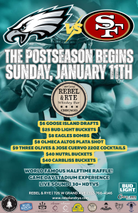 Playoff football deserves a playoff atmosphere — grab your crew, claim your spot early, and settle in for an electric Sunday at Rebel & Rye.