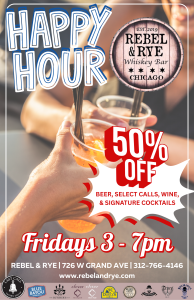 Why wait for the weekend when you can start it with a bang—and half-price booze? Rebel & Rye’s Friday Happy Hour runs from 3 to 7 PM and takes 50% off beer, select call drinks, wine, and signature cocktails. Whether you’re toasting the end of the workweek or just feeling a little rebellious in River West, our rustic whiskey bar is the perfect place to get a head start on the fun. Whiskey wisdom says: don’t be late.